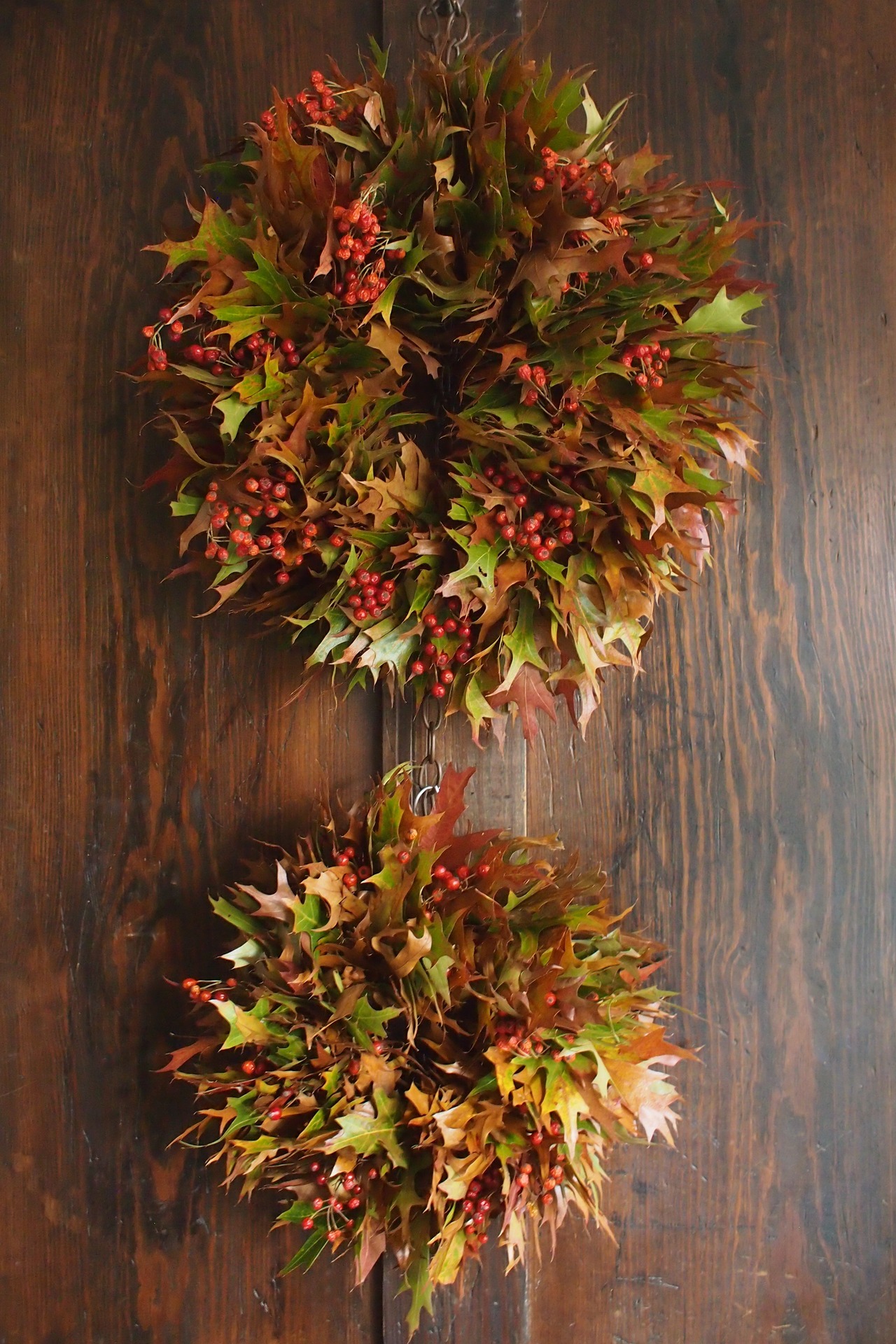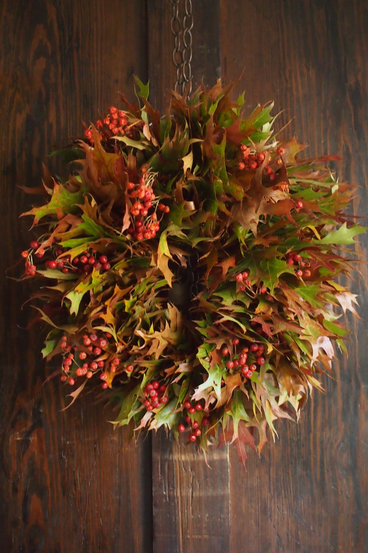 自然の美しさを楽しめるピンオークと野バラの実のリース。秋の訪れを感じさせるピンオークの葉を一枚一枚重ねてリースは素朴で優しい雰囲気を演出します。